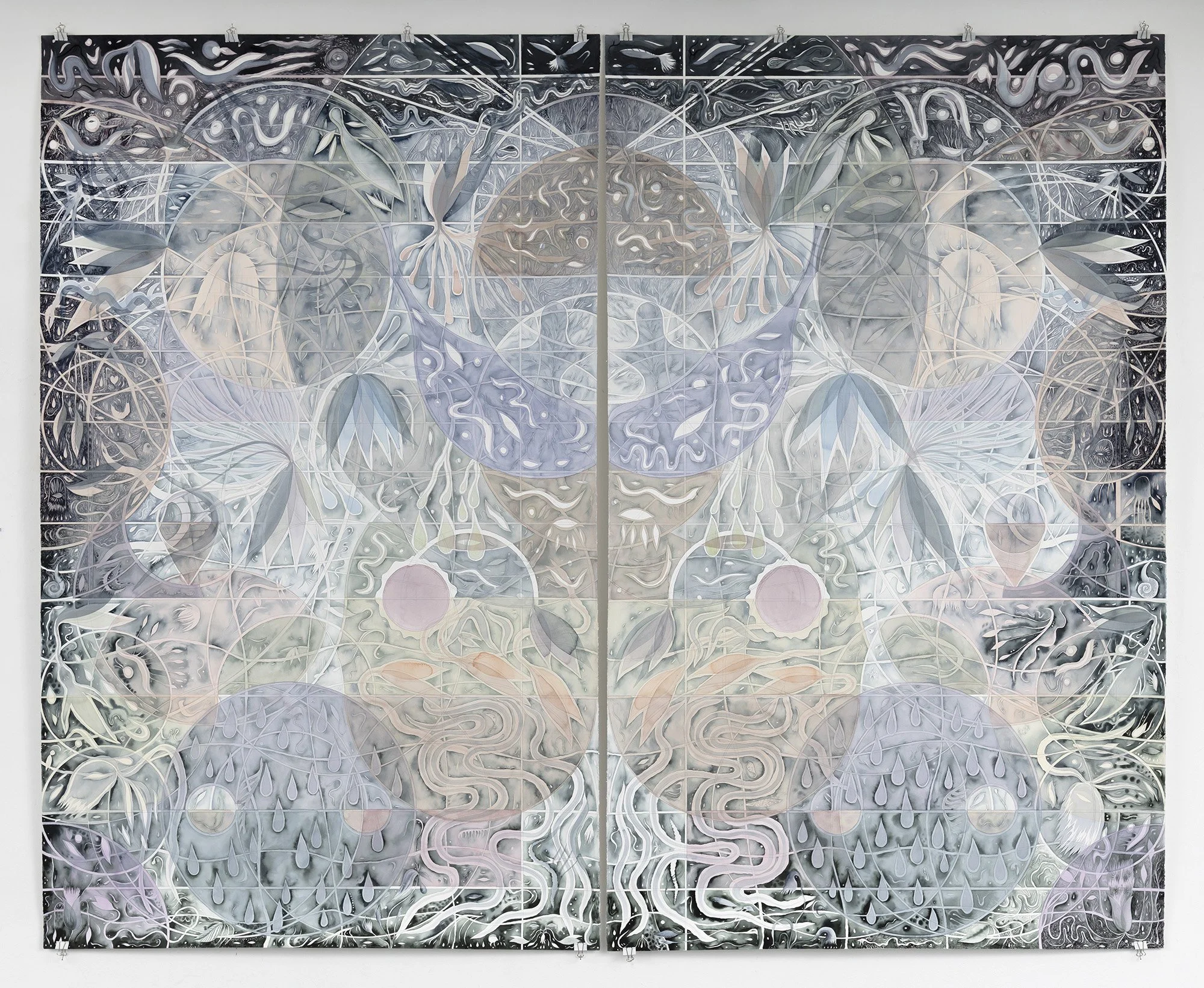 Bergene bygger opp sine geometrisk-ladede billedrom ved bruk av akvarell, gouache og fargeblyant, som oftest utarbeides i monumental format på tykke 640grams bomullspapirer som tåler en støyt.